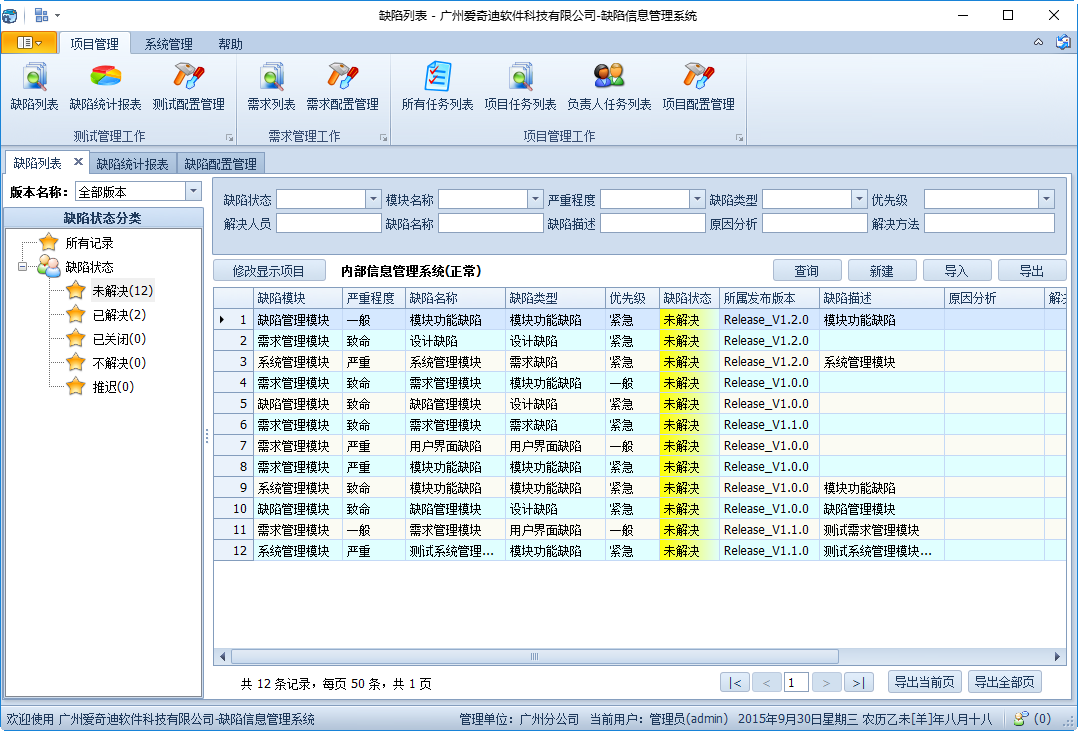 該軟件的功能包括:缺陷的維護管理(可上傳圖片)、項目列表維護、模塊列表維護、版本列表維護(數(shù)據(jù)字典維護(缺陷狀態(tài)、缺陷類型、緊急程度、優(yōu)先級)、用戶及功能權限管理、機構數(shù)據(jù)權限管理等功能。軟件能夠規(guī)范項目開發(fā)過程中的缺陷記錄跟蹤流程、能夠根據(jù)不同的角色和機構分配不同的缺陷,極大提高項目開發(fā)及管理水平。軟件界面美觀大方,方便使用。